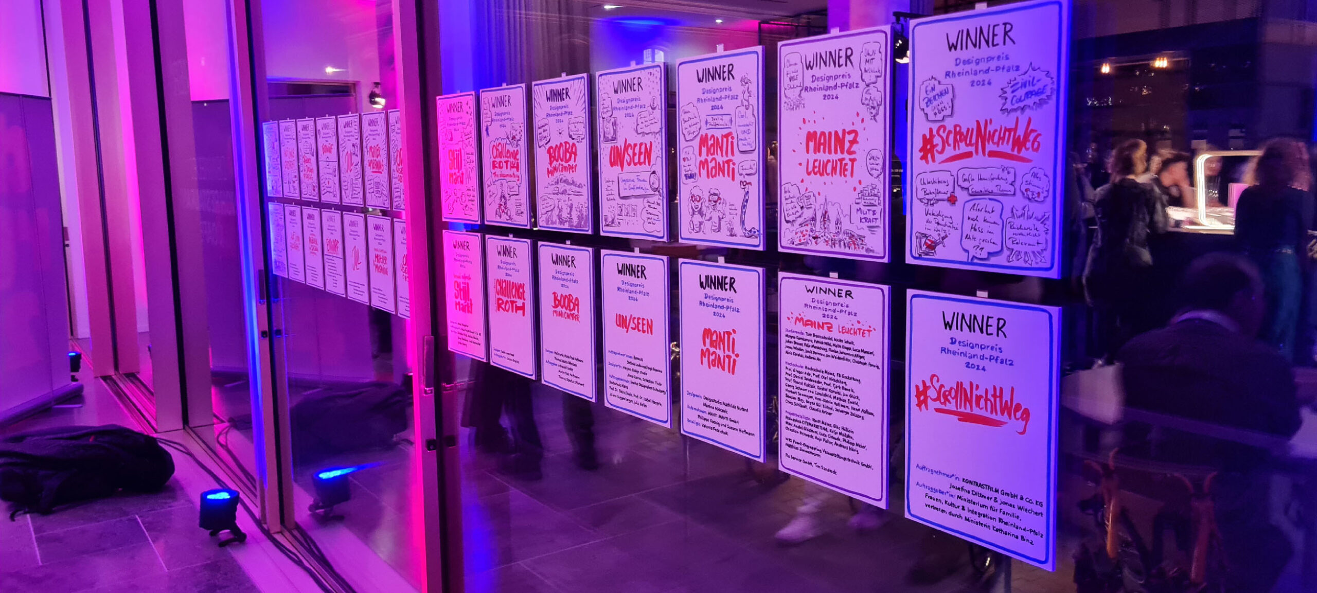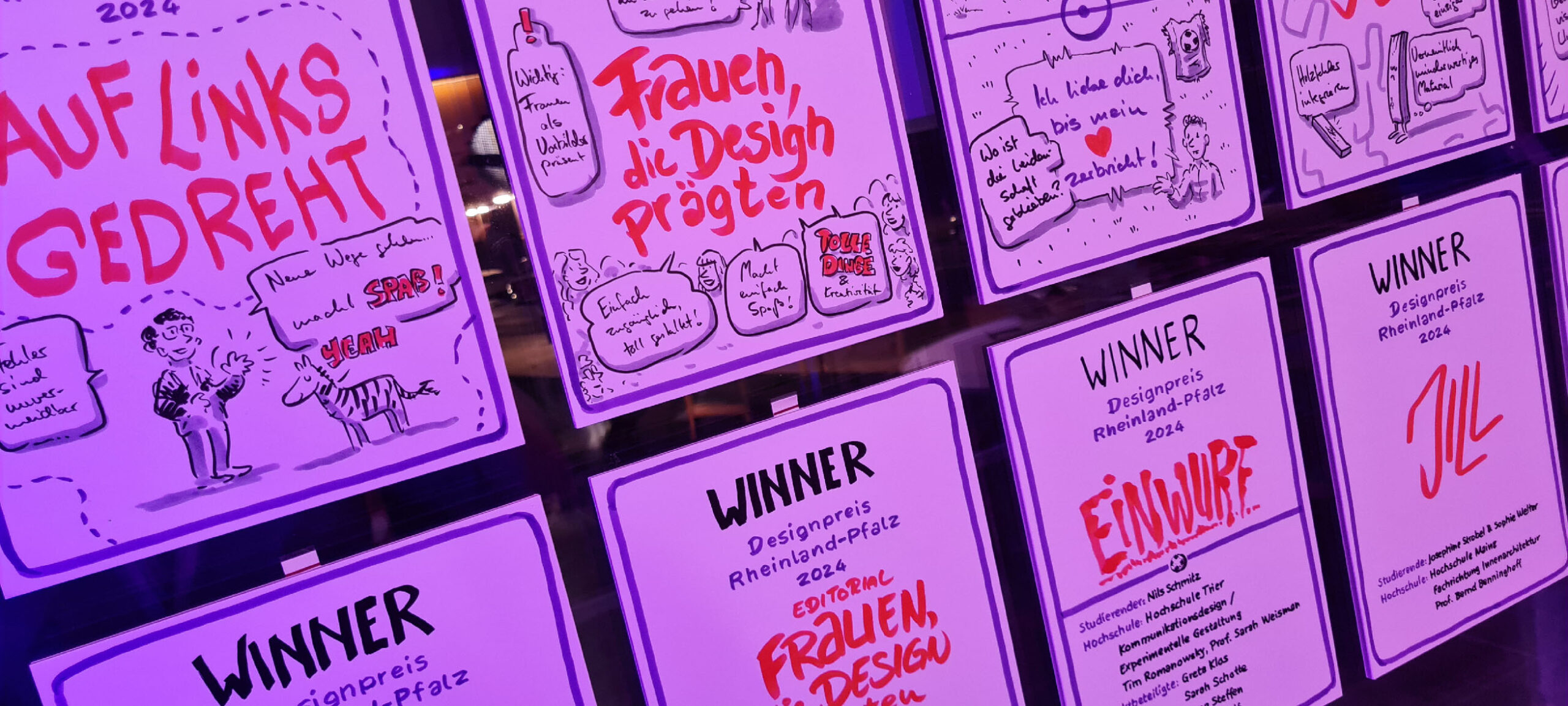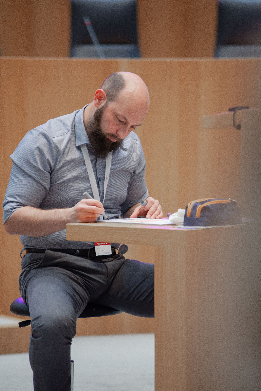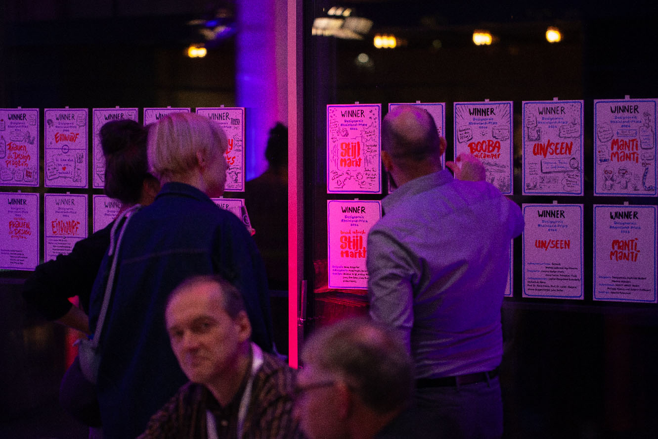 Für die Verleihung des Designpreises des Landes Rheinland-Pfalz 2024 durfte ich auf dem Sitz des Protokollanten im Landtag Platz nehmen. Für die Gewinner und Redner habe ich jeweils eine DinA4 Kapa Platte zum jeweiligen Projekt gezeichnet; insgesamt 15 Stück. Aufgrund der extrem kurzen Zeitslots (ca. 5 Minuten pro Platte) hatte ich schon die Grunddaten vorbeireitet. Live wurden dann Eindrücke aus den Reden, Gesprächen und Kurzfilmen eingefügt.
