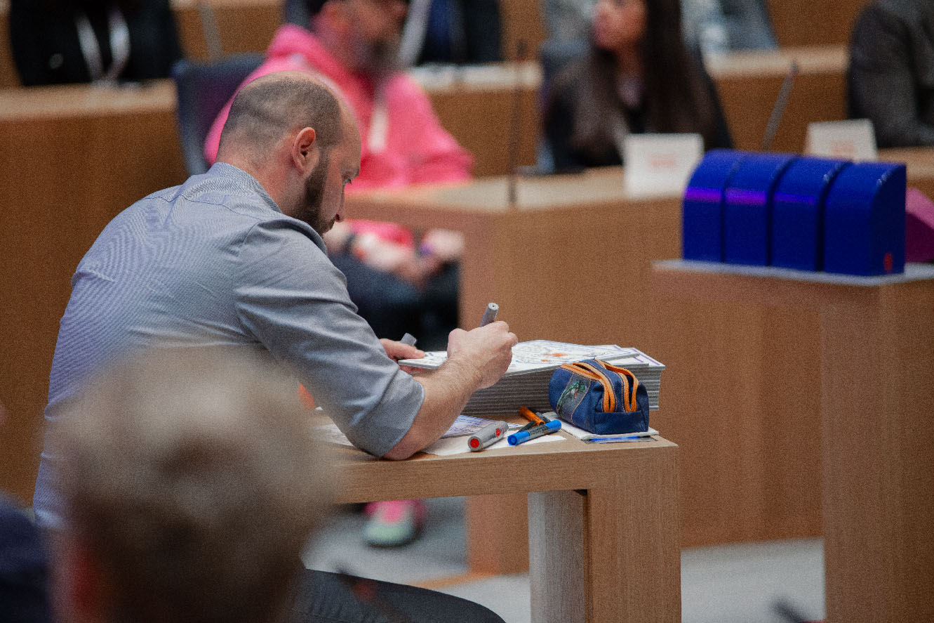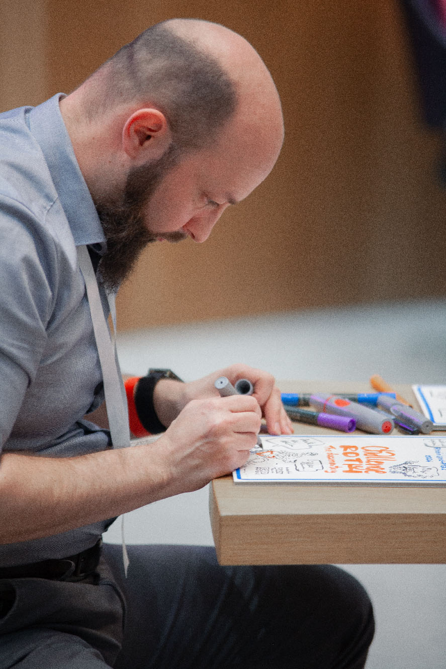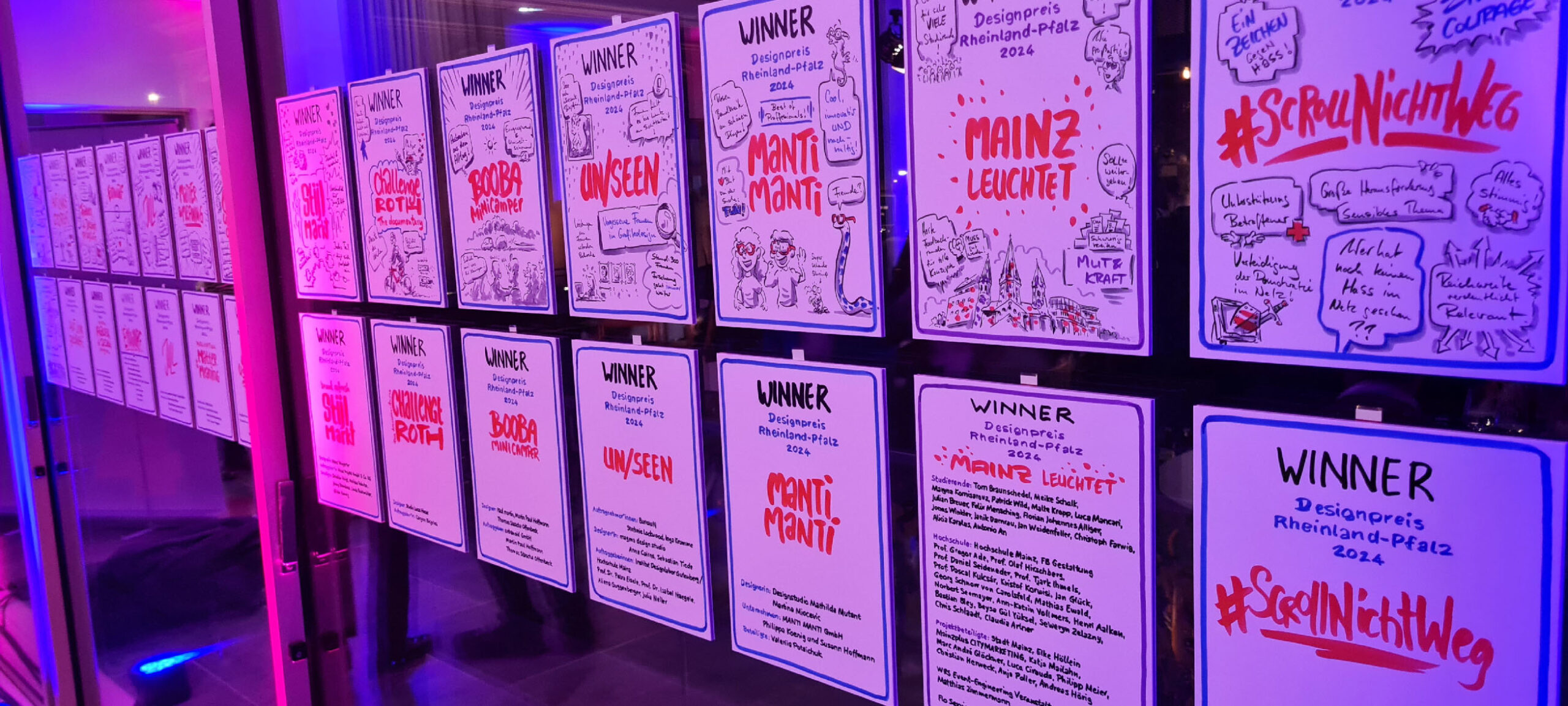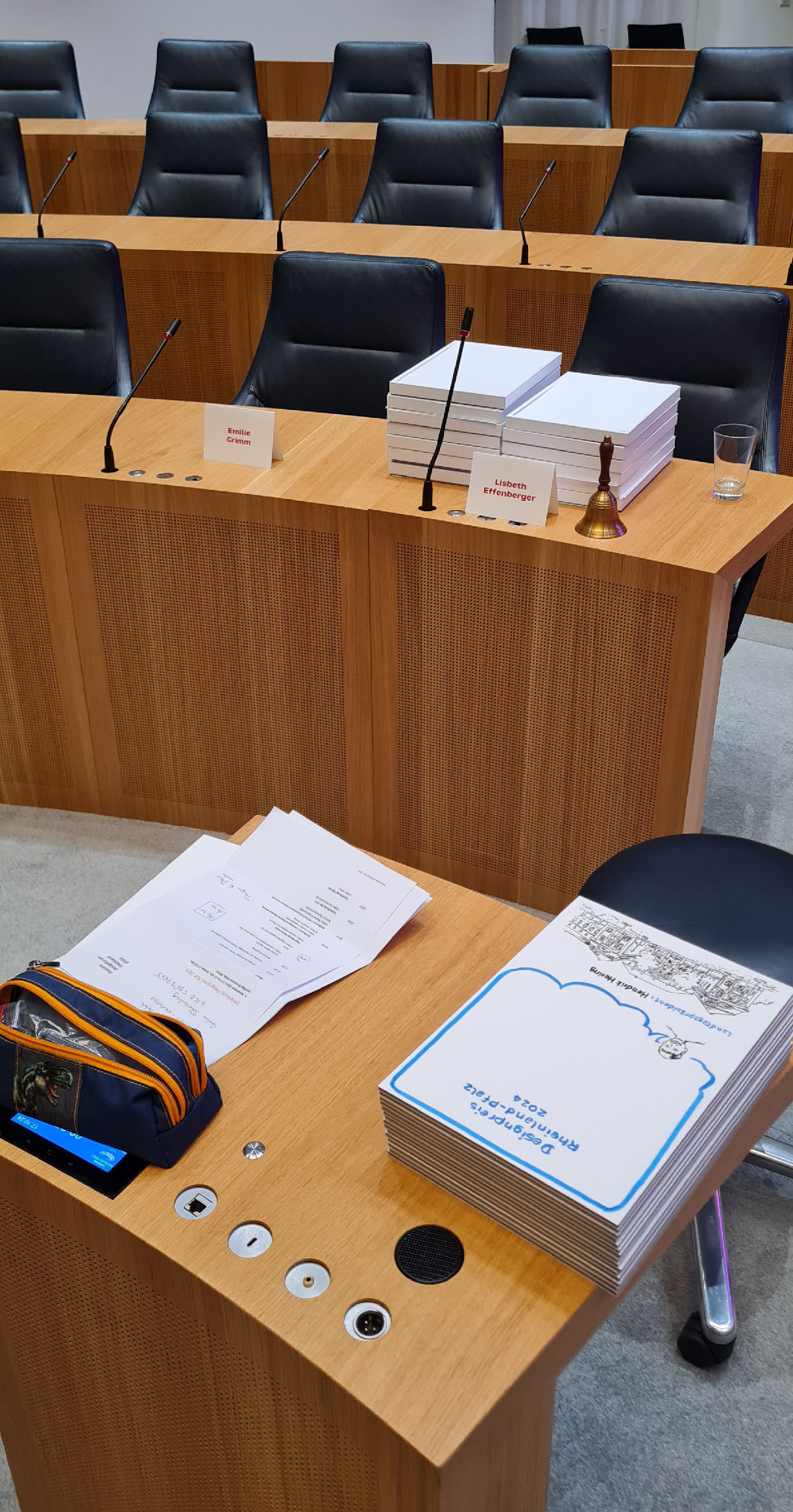 Für die Verleihung des Designpreises des Landes Rheinland-Pfalz 2024 durfte ich auf dem Sitz des Protokollanten im Landtag Platz nehmen. Für die Gewinner und Redner habe ich jeweils eine DinA4 Kapa Platte zum jeweiligen Projekt gezeichnet; insgesamt 15 Stück. Aufgrund der extrem kurzen Zeitslots (ca. 5 Minuten pro Platte) hatte ich schon die Grunddaten vorbeireitet. Live wurden dann Eindrücke aus den Reden, Gesprächen und Kurzfilmen eingefügt.